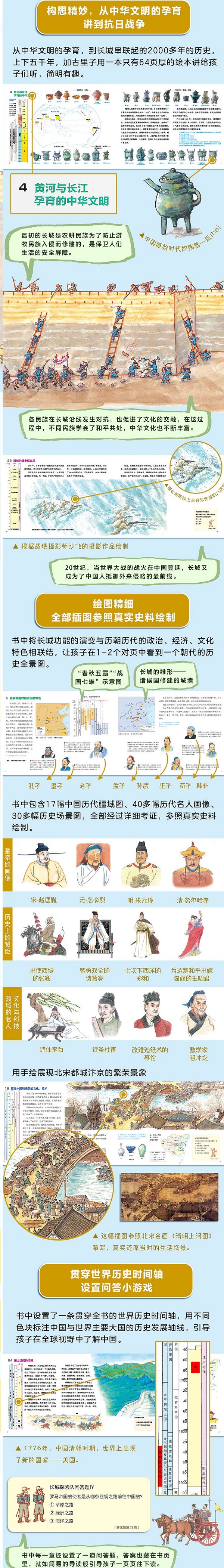 从长城诞生之前的原始文化的孕育,到春秋战国时期长城雏形的形成,再到后来抗日战争时期战云密布的长城,书中以长城为线索,展现中国上下五千年的历史。孩子们将在书中看到各个朝代的历史文化发展,也会了解中国人民在风风雨雨中,为获取幸福生活所做出的不懈努力。